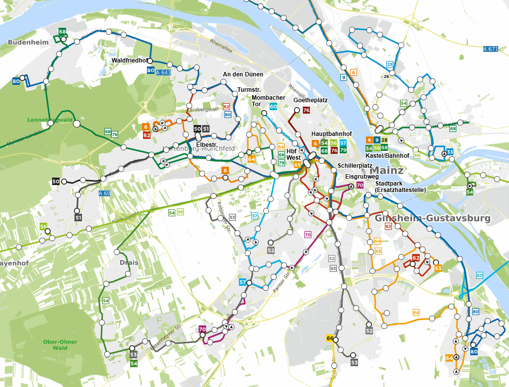 - Von und nach Mombach fahren nur die Linien 62 und 80